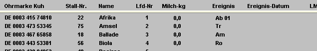 In der Tierliste erscheint jeweils nach der Eingabe in der Spalte „Ereignis“ Ab für Abgang zusammen mit dem Abgangsgrund, Tr für trocken, Am für Amme oder Ro für Roboter. Falls ein Trockenstell- oder Abgangsdatum eingegeben wurde, wird das Datum in der Spalte „Ereignis-Datum“ angezeigt